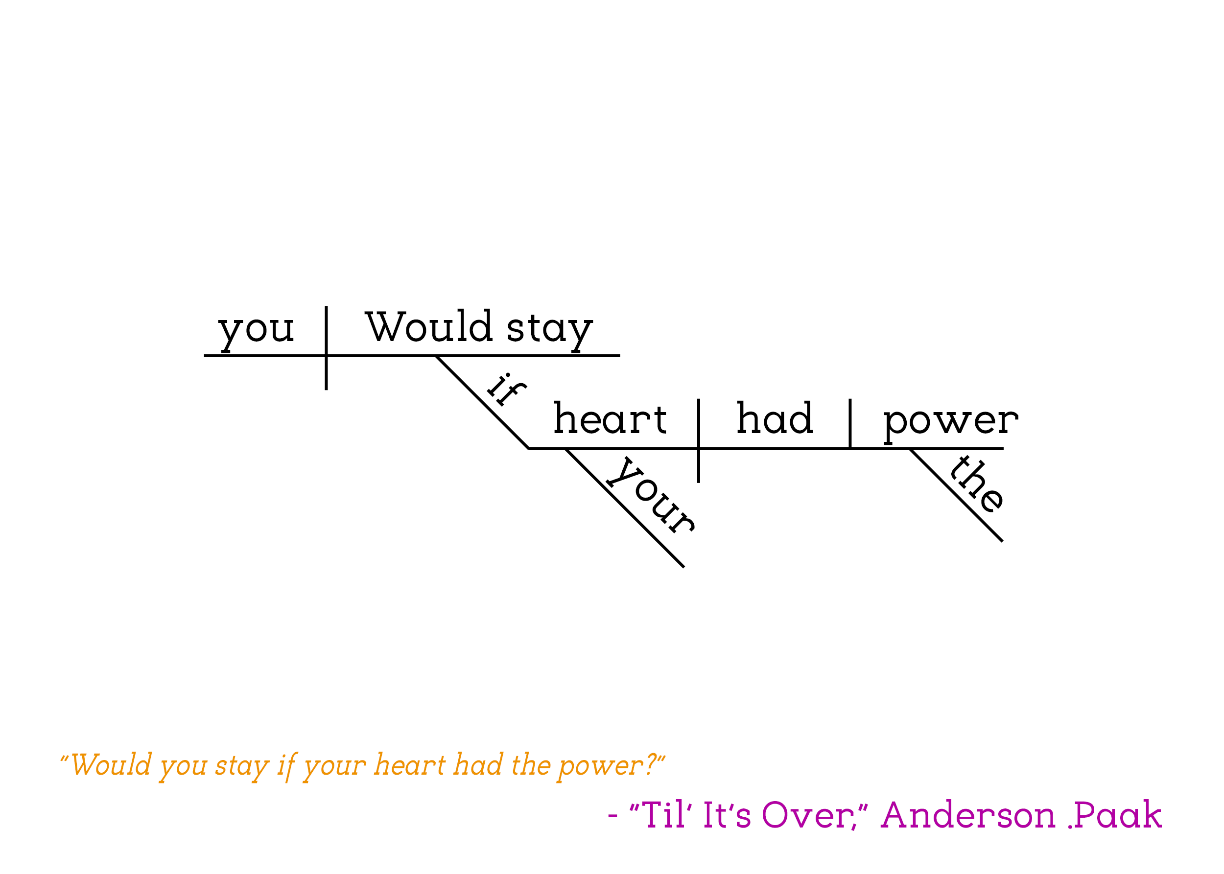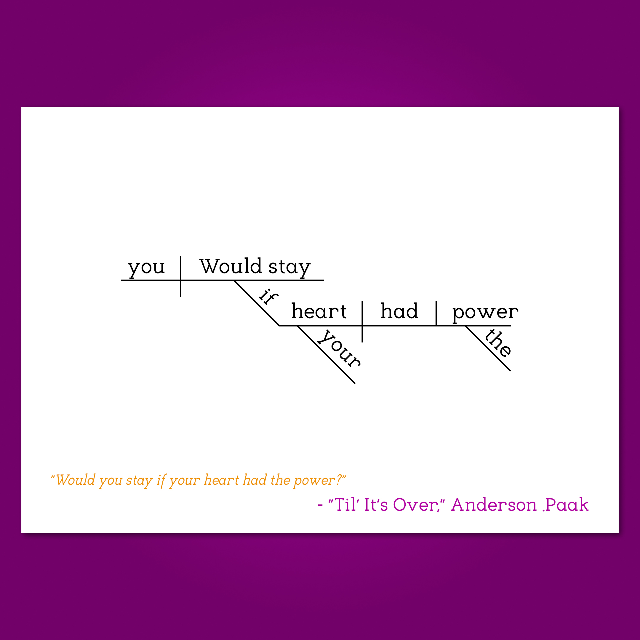 Part of the Sentence Diagram Collection, in which famous quotes from pop culture are filtered through the Reed-Kellogg system of sentence diagramming to create minimalist word art that bring character to any available wall space.