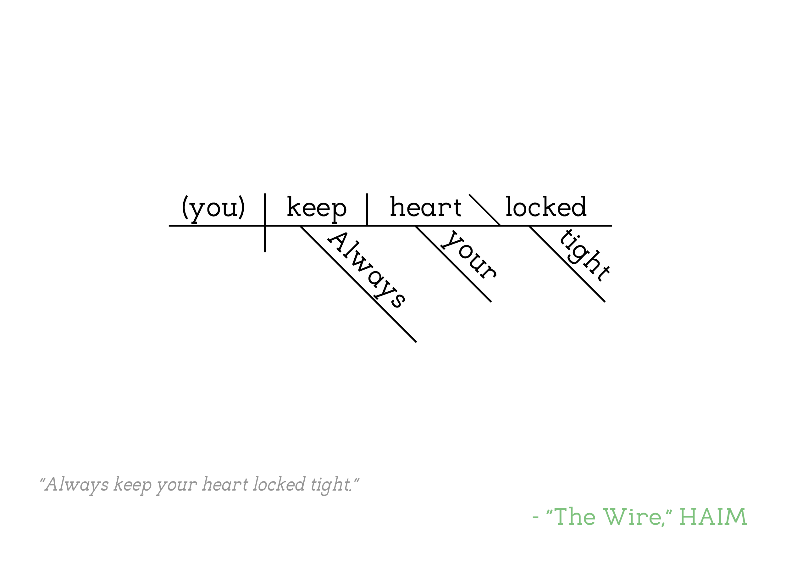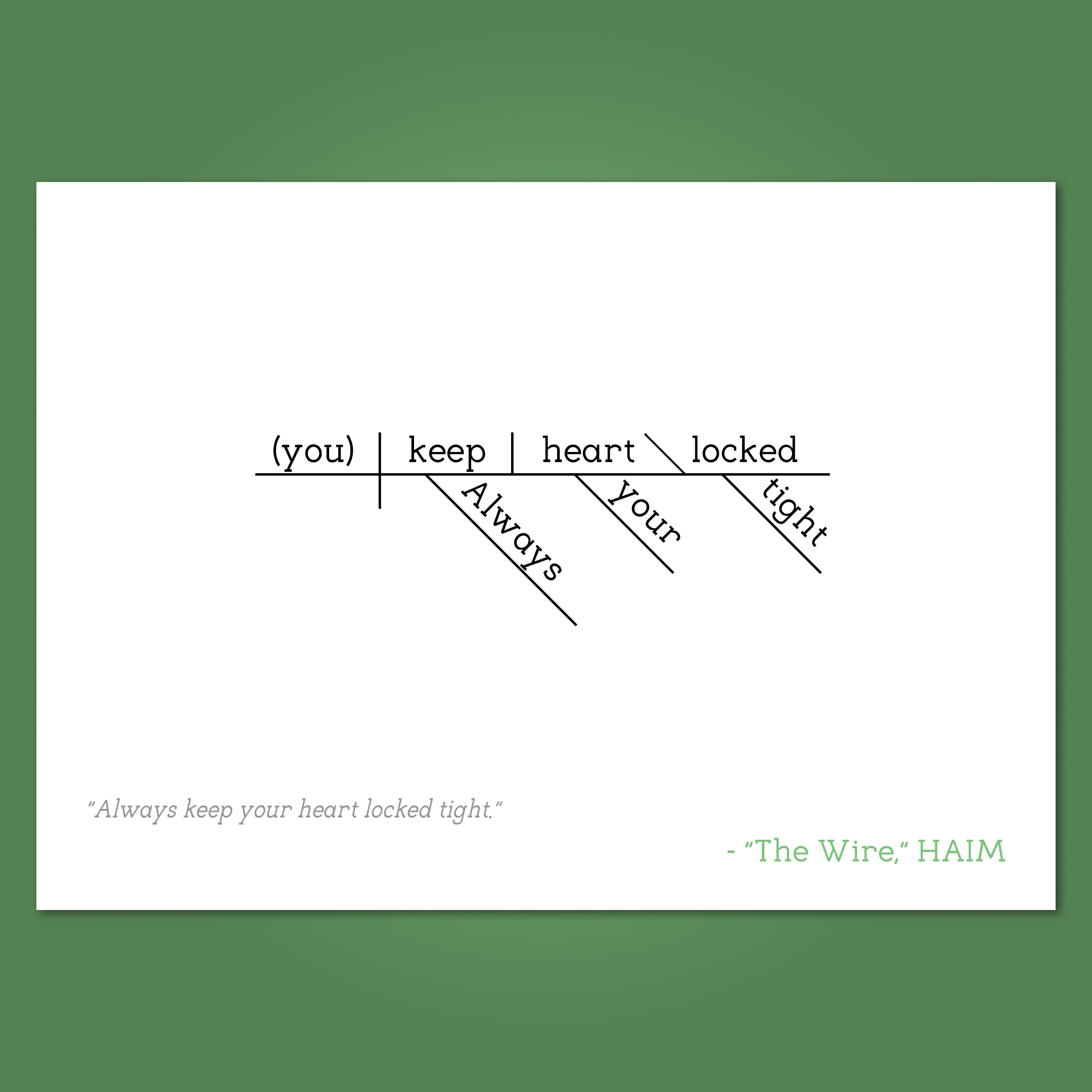Part of the Sentence Diagram Collection, in which famous quotes from pop culture are filtered through the Reed-Kellogg system of sentence diagramming to create minimalist word art that bring character to any available wall space.
