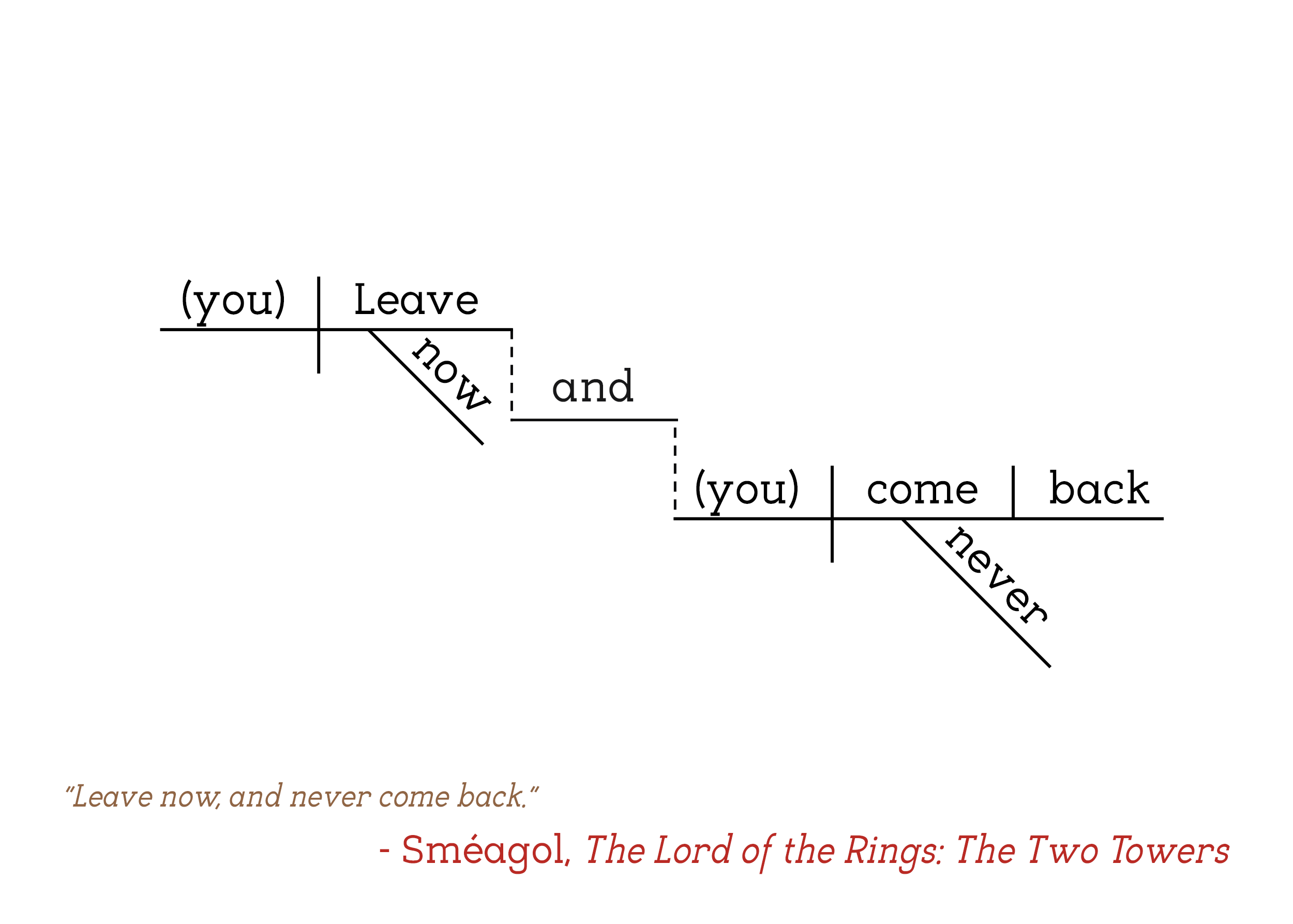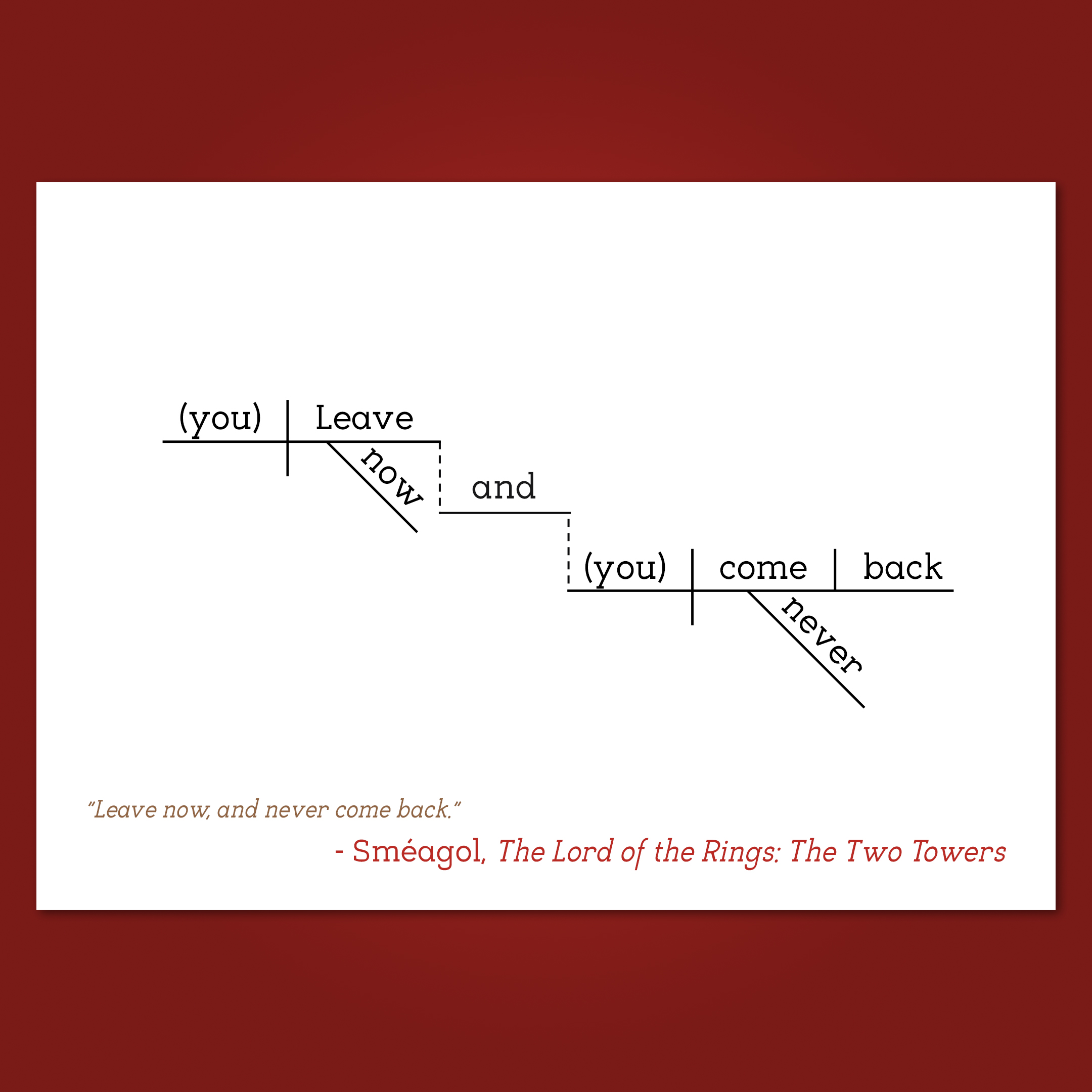 Part of the Sentence Diagram Collection, in which famous quotes from pop culture are filtered through the Reed-Kellogg system of sentence diagramming to create minimalist word art that bring character to any available wall space.