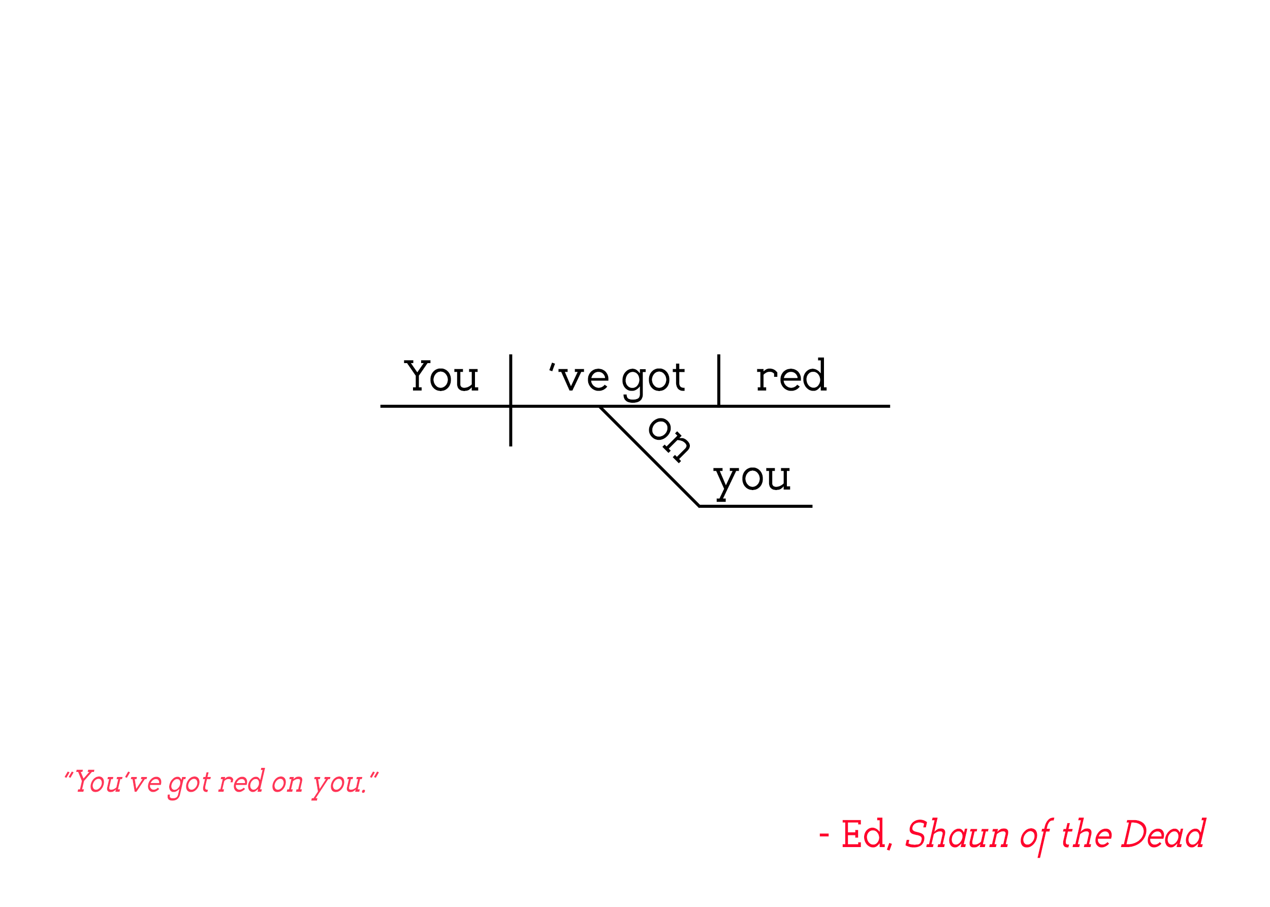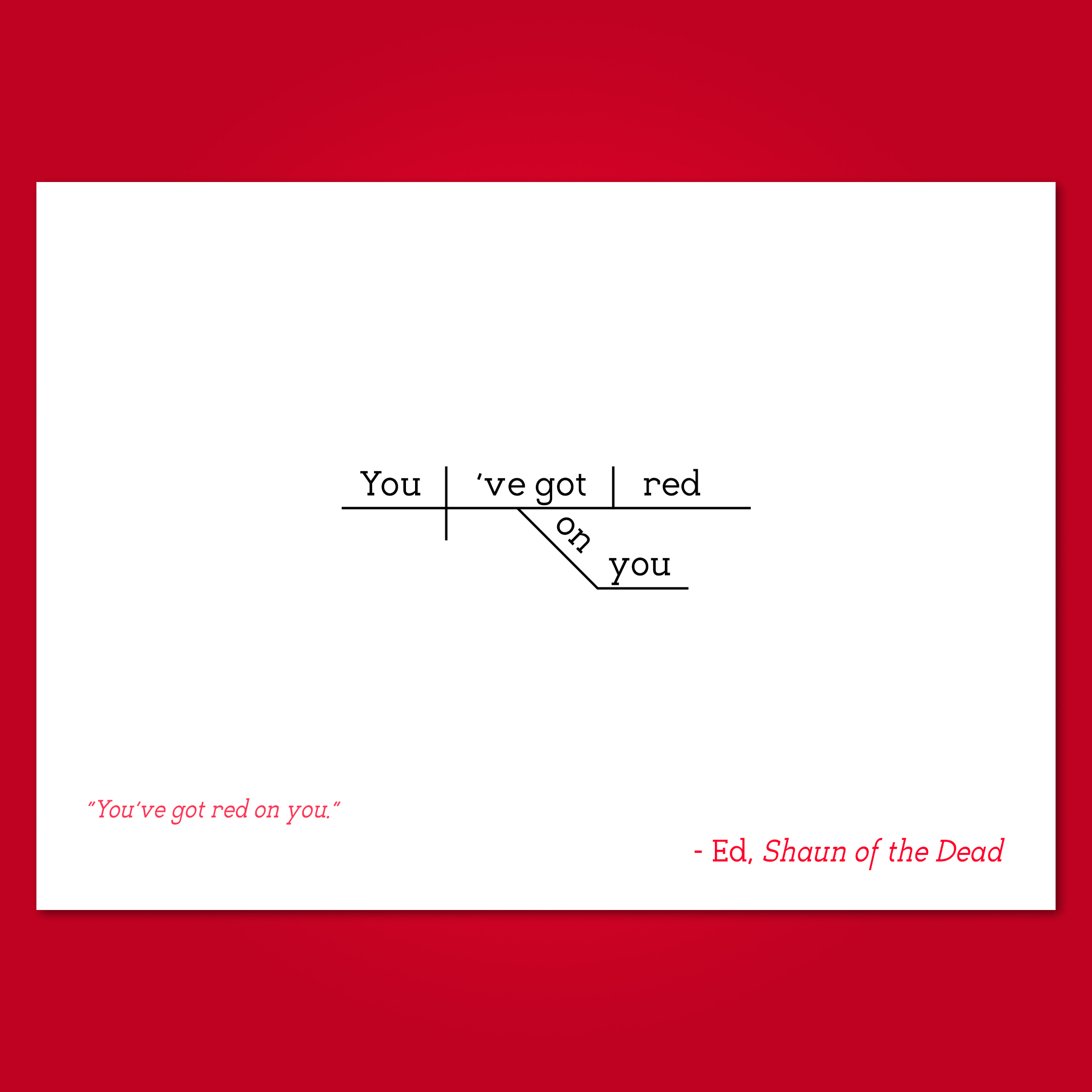 Part of the Sentence Diagram Collection, in which famous quotes from pop culture are filtered through the Reed-Kellogg system of sentence diagramming to create minimalist word art that bring character to any available wall space.