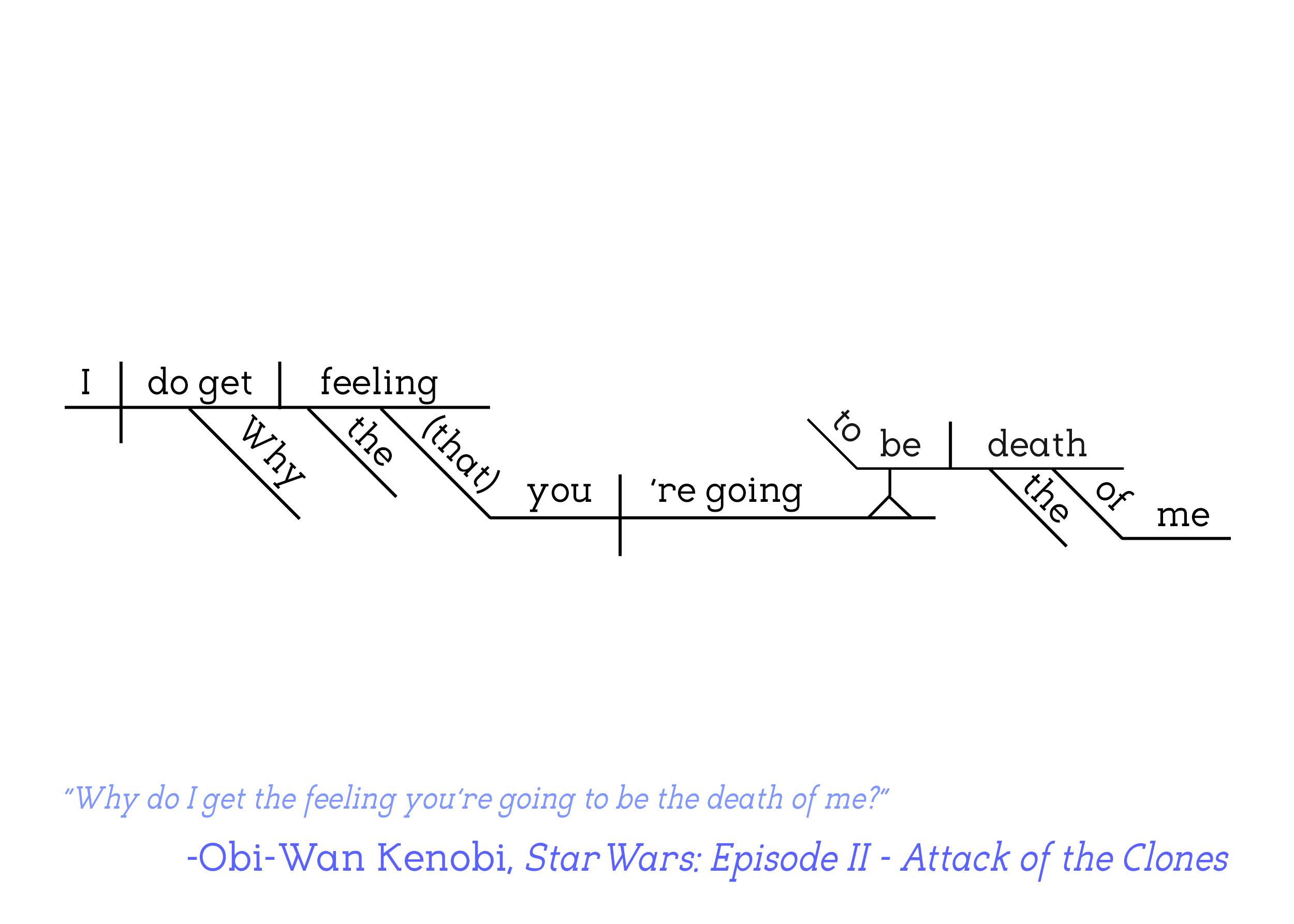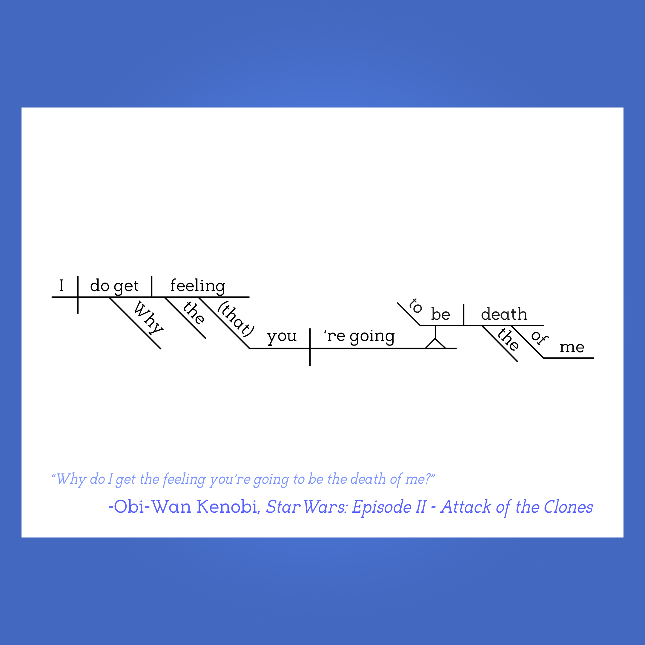 Part of the Sentence Diagram – Star Wars Collection, in which famous quotes from Star Wars are filtered through the Reed-Kellogg system of sentence diagramming to create minimalist word art that bring character to any available wall space.