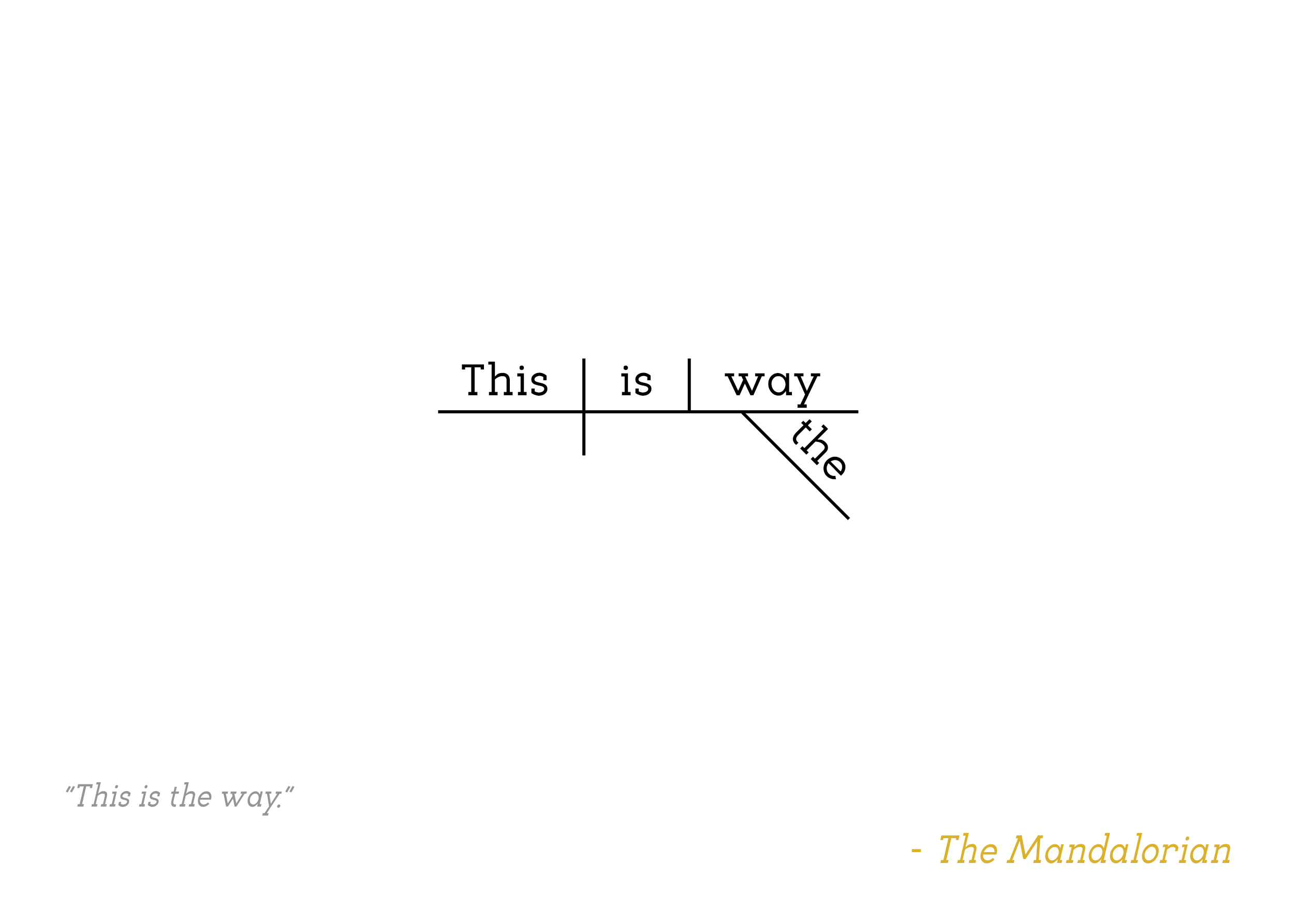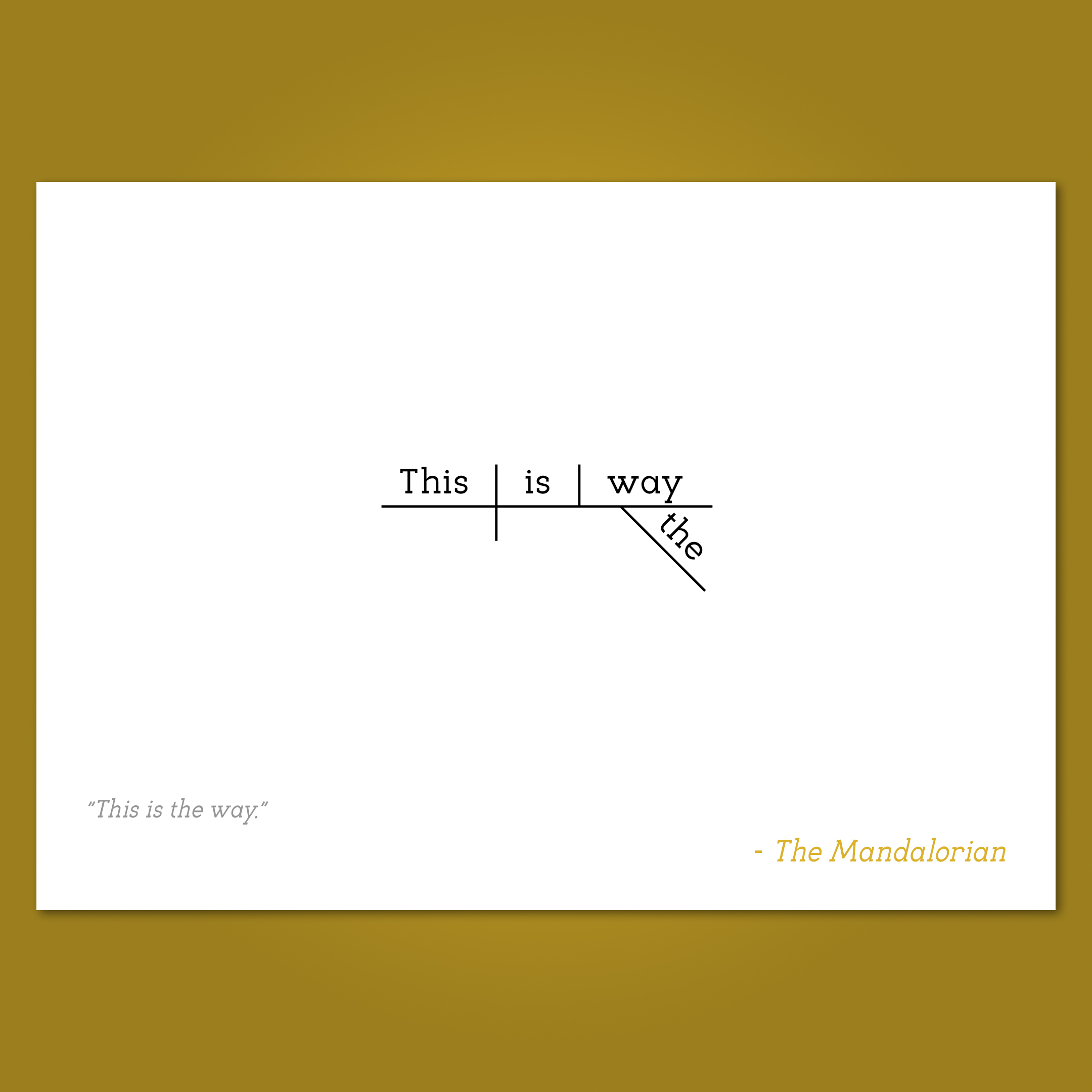 Part of the Sentence Diagram Collection, in which famous quotes from pop culture are filtered through the Reed-Kellogg system of sentence diagramming to create minimalist word art that bring character to any available wall space.